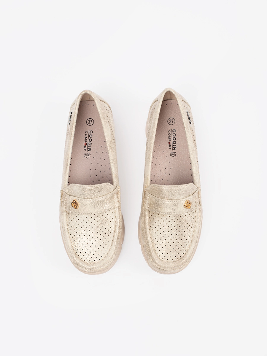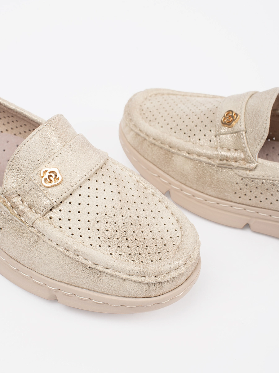 Interesting women's gold loafers without heel