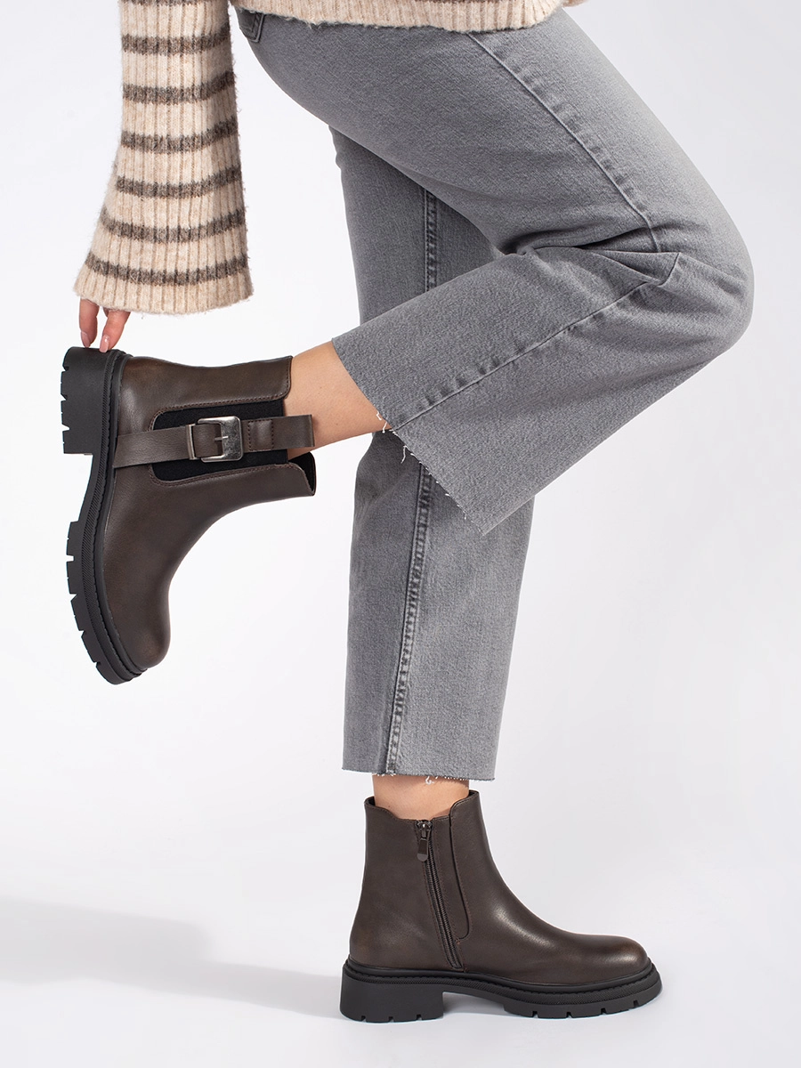 Modern brown women's ankle boots on a wide heel