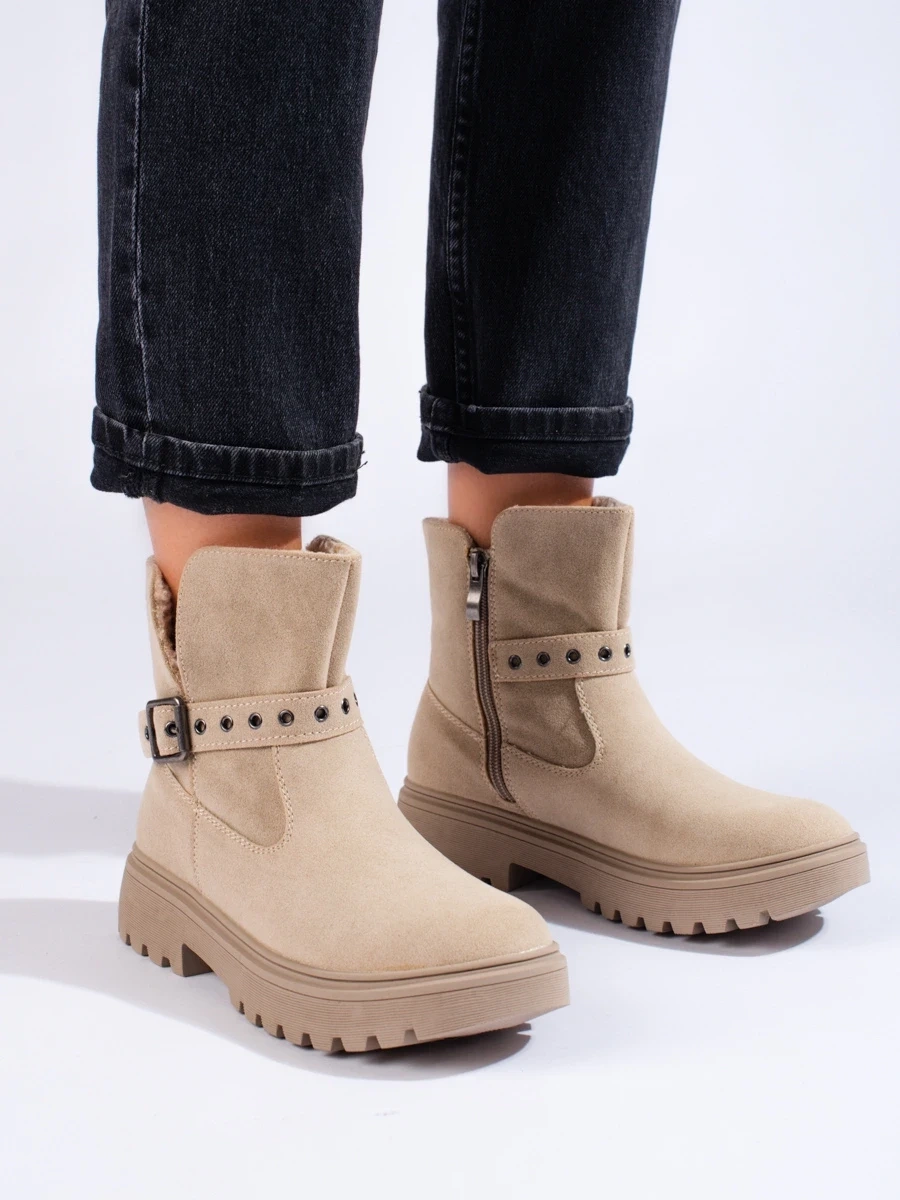 Practical beige flat heeled ankle boots for women