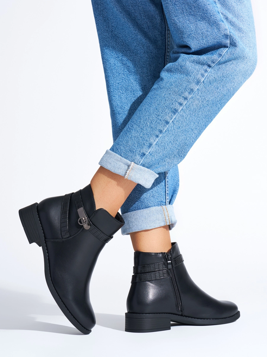 Stylish women's black ankle boots on flat heel