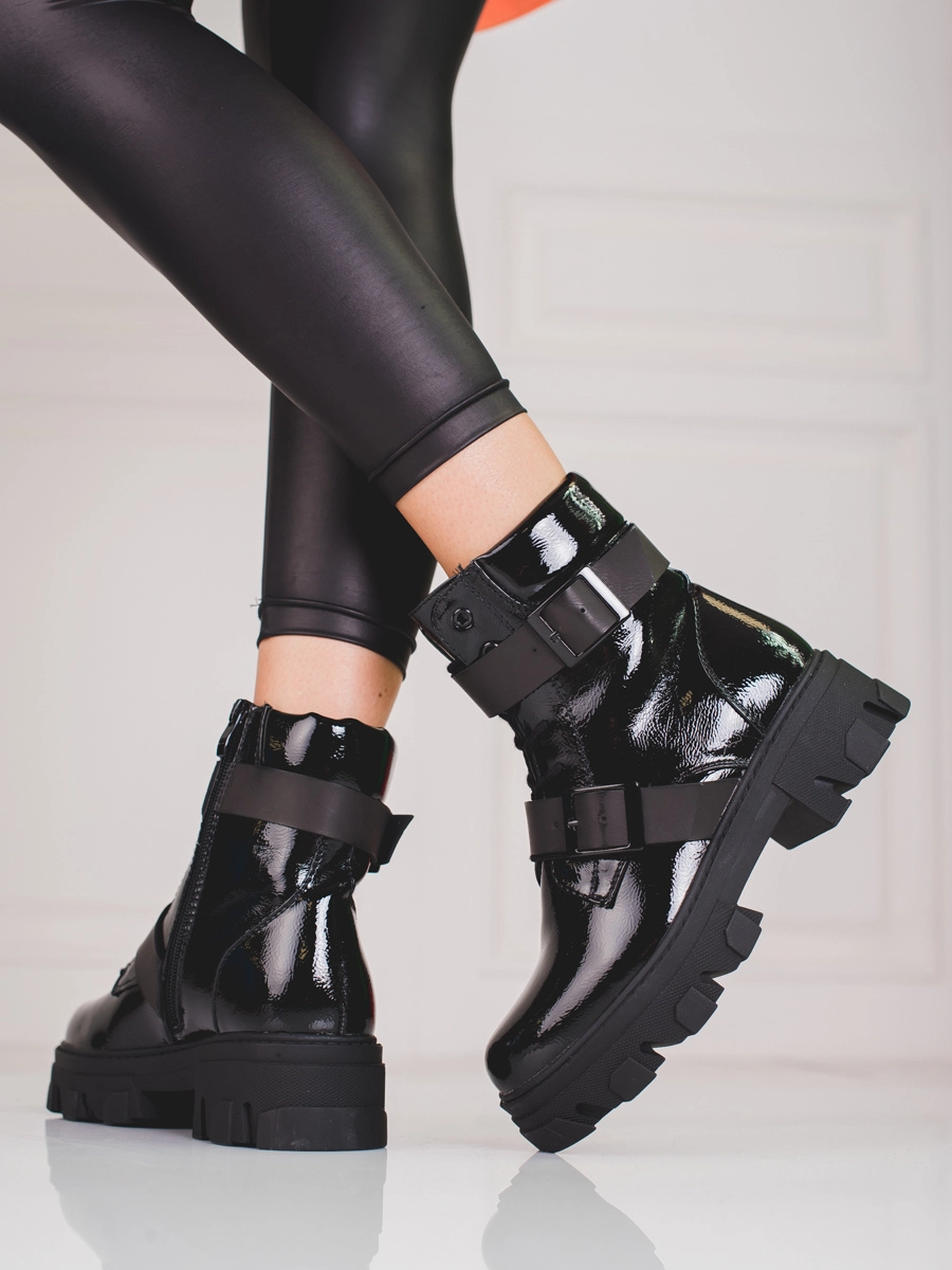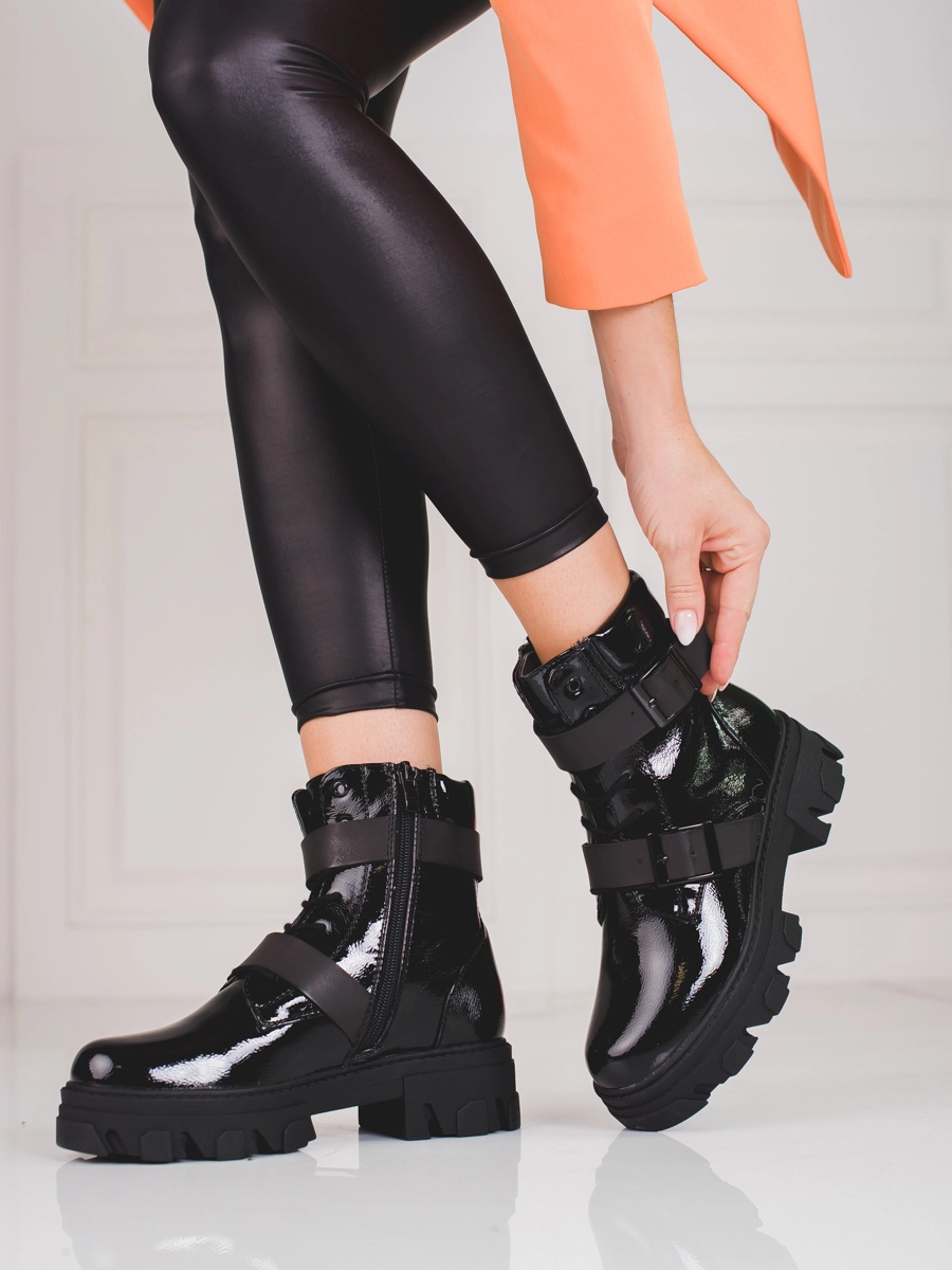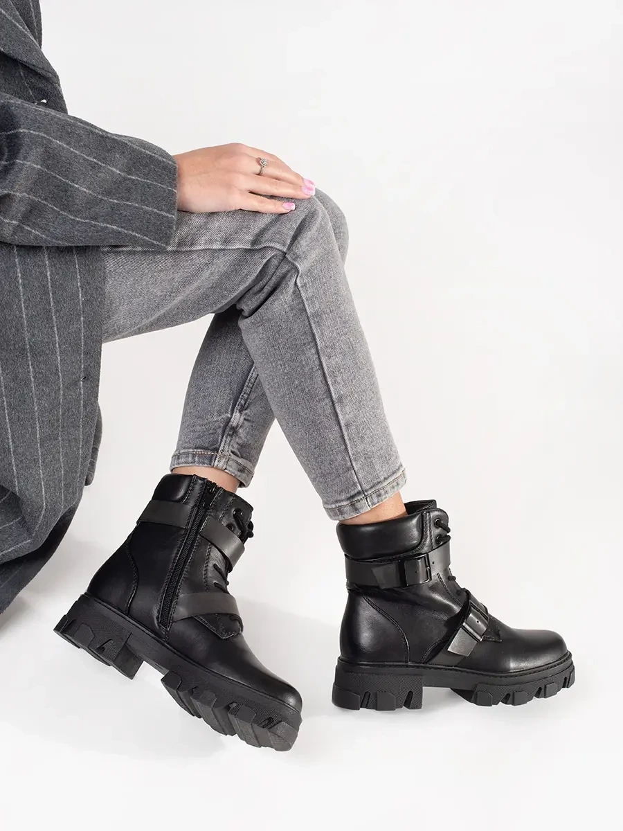 Trendy black women's ankle boots on flat heel
