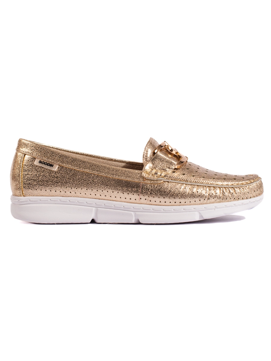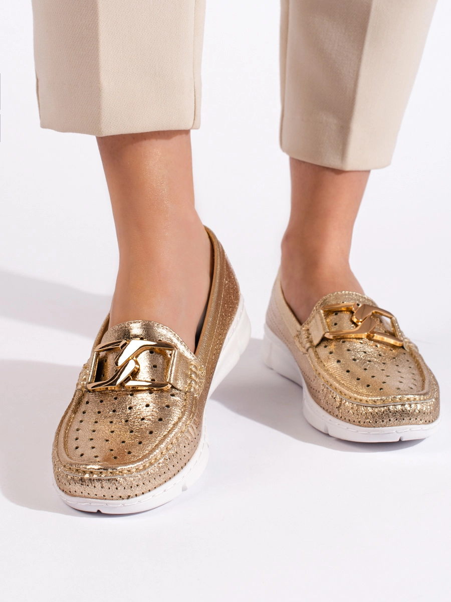 Women's comfortable gold loafers without heel